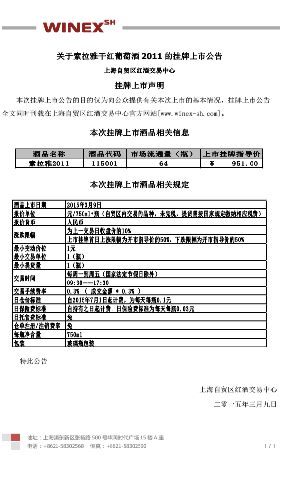 关于索拉雅干红葡萄酒2011的挂牌上市公告