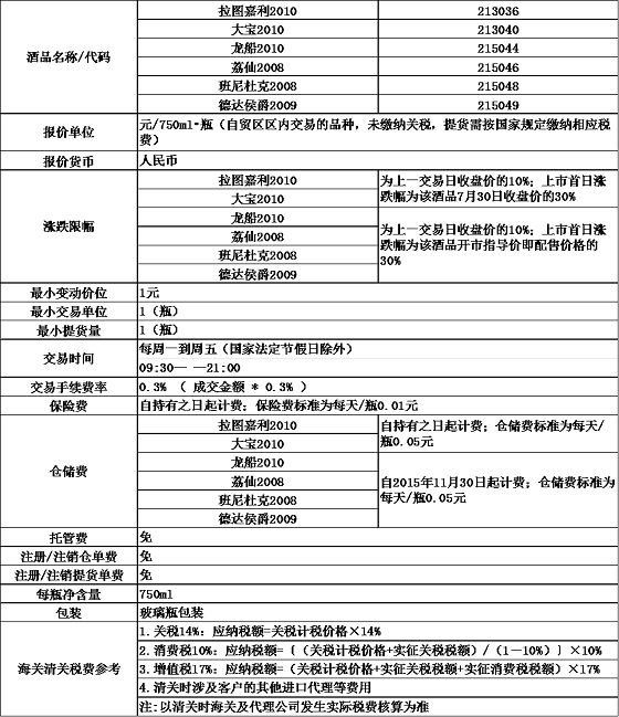自上市日起,持有拉图嘉利2010大宝2010龙船2010荔仙2008班尼杜克2008德达侯爵2009的交易用户可以在本交易平台挂牌交易;也可以选择持有酒品不动,提取酒品,其中本次配售酒品拉图嘉利2010大宝2010在2015年7月31日挂牌上市日起可提交提货手续,提取酒品;龙船2010荔仙2008班尼杜克2008德达侯爵2009在2015年11月始提交提货手续,提取酒品。