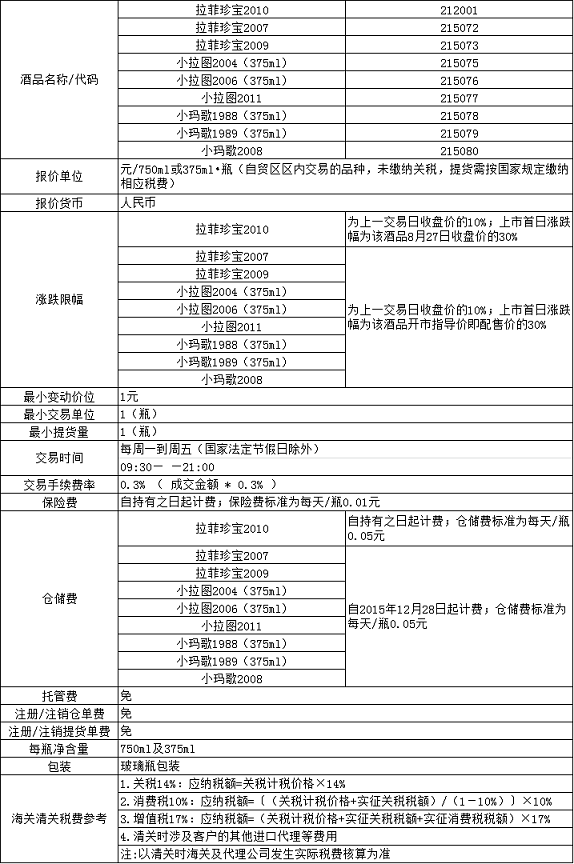 自上市日起,持有拉菲珍宝2010、拉菲珍宝2007、拉菲珍宝2009、小拉图2004(375ml)、小拉图2006(375ml)、小拉图2011、小玛歌1988(375ml)、小玛歌1989(375ml)及小玛歌2008的交易用户可以在本交易平台挂牌交易;也可以选择持有酒品不动,提取酒品,其中本次配售酒品拉菲珍宝2010在2015年8月28日挂牌上市日起可提交提货手续,提取酒品;拉菲珍宝2007、拉菲珍宝2009、小拉图2004(375ml)、小拉图2006(375ml)、小拉图2011、小玛歌1988(375ml)、小玛歌1989(375ml)及小玛歌2008在2015年12月始提交提货手续,提取酒品。