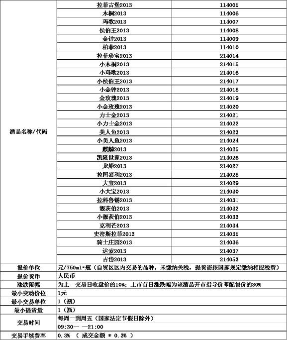 经本中心研究决定,配售酒品拉菲古堡2013计57(瓶)、木桐2013计59(瓶)、玛歌2013计26(瓶)、侯伯王2013计24(瓶)、金钟2013计25(瓶)、柏菲2013计30(瓶)、拉菲珍宝2013计81(瓶)、小木桐2013计120(瓶)、小玛歌2013计44(瓶)、小侯伯王2013计22(瓶)、小金钟2013计29(瓶)、金玫瑰2013计18(瓶)、小金玫瑰2013计110(瓶)、力士金2013计54(瓶)、小力士金2013计30(瓶)、美人鱼2013计36(瓶)、小美人鱼2013计120(瓶)、麒麟2013计27(瓶)、凯隆世家2013计73(瓶)、龙船2013计31(瓶)、拉图嘉利2013计30(瓶)、大宝2013计40(瓶)、小大宝2013计25(瓶)、拉科鲁锡2013计18(瓶)、靓茨伯2013计24(瓶)、小靓茨伯2013计36(瓶)、克利芒2013计24(瓶)、史密斯拉菲2013计12(瓶)、骑士庄园2013计58(瓶)、达索2013计8(瓶)及古岱2013计171(瓶)于2015年10月23日在本平台挂牌上市交易。